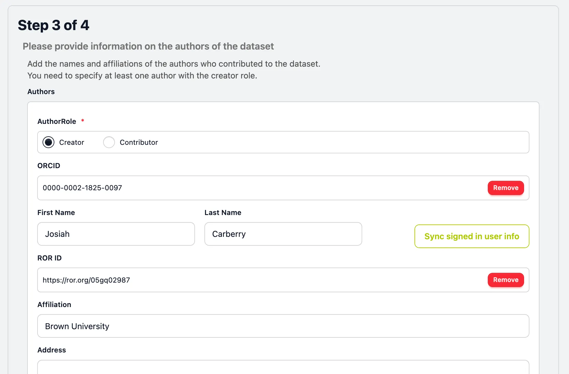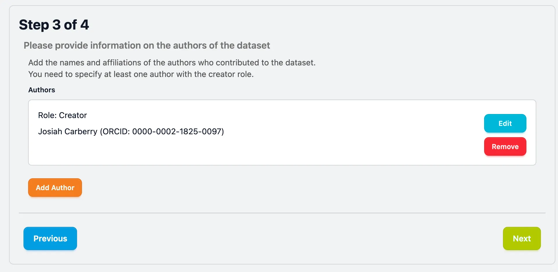 In this step of the submission, you list the individuals who created and contributed to the dataset. Correctly identifying authors ensures that everyone receives proper credit and that your data can be cited accurately.